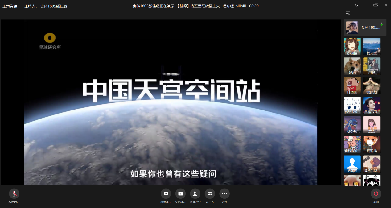 党课以介绍中国航天的视频开始,视频中介绍了中国天宫空间站建成的过程及目的。中国航天从零开始,发展过程中遭受重重阻碍,历经50多载,从天宫一号让我国成为世界上第三个完整掌握空间交会对接技术的国家,到天宫二号实现中期驻留,脚踏实地完成了载人航天技术的全面认证。载人航天技术的发展和转化,为人类生活带来了不计其数的好处,为科学研究提供了难得的实验条件。从一穷二白的年代到如今国家大力扶持航天,航天科学家、工程师们始终在这条漫长而艰辛的道路上前进。随着今年天问一号计划成功,中国成为地球上第一个首次火星任务就完成环绕、降落、巡查三步的国家;也是第二个真正让火星车在火星上工作的国家,仅次于美国。