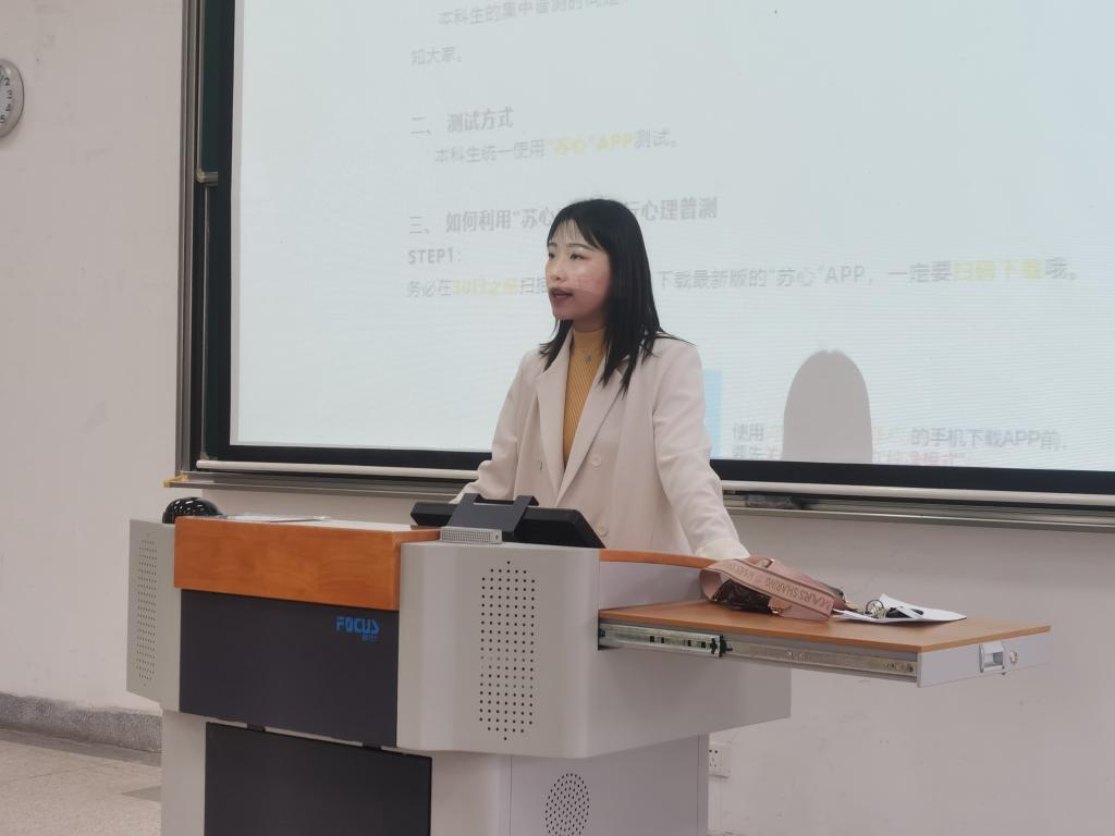 胡晓丹首先向同学们说明开展新生心理普测的必要性,消除新同学们对于心理测试的误解,并根据学校发布的测试指南,向同学们讲解“苏心”APP使用流程。随后,同学们按照“苏心”APP测试流程参与线上普测,测试方式严格保密、新颖便捷,同学们都较为顺利地完成各项量表的填报。测试结束后,有疑问的同学也与现场老师们积极沟通,气氛融洽。