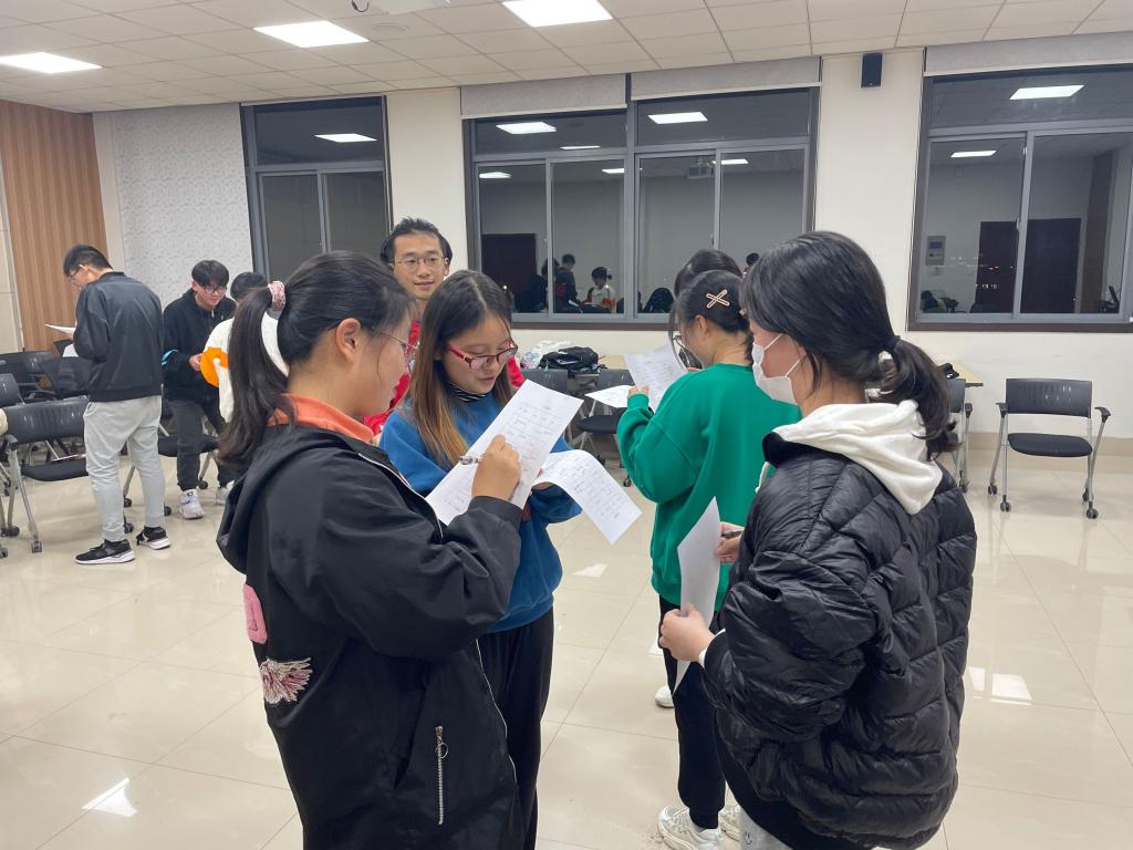 第一个环节是热身活动"桃花朵朵开",同学们按照主持人报出的开花朵数快速抱成团,游戏热身结束后,大家积极分享了该环节的参与体验。随后活动进入“动物进化论”环节,心理委员同学们在活动中共有“鸡蛋”、“小鸡”、“大鸡”三种形态,分别对应全蹲,半蹲,站立的姿势,如果猜拳胜利,则“成长”;如果猜拳失败,则“退化”。同学们参与热情高涨,活动氛围也被推向高潮。接下来的环节是寻人信息卡,胡晓丹为现场同学分发卡片,上面写有各种代表个人特征的词语,同学们先找到符合本人的特征,再寻找具有相同特征的同学并让对方签下名字,在活动中加深了对彼此的印象。在所有同学结束签名后,大家一起讨论获得签名多或少的原因,个别参与者还积极踊跃地分享了在活动环节中的感受。下一个环节是“信任行走”,两人一组分别扮演“盲人”和“哑巴”的角色,“哑巴”在不能说话的前提下帮助“盲人”同学顺利通过路障。这个环节增强了团队内成员间的信任和团队合作能力。最后一个环节是互写赠言,每位同学将自己想对在场同学说的话写在便签纸上,并送给相应同学,参与者的情感在寄语中迅速升温。活动结束前,胡老师引导现场同学用一个词总结自己在此次团辅中的感受,并希望各位心理保健委员同学能将个人体会和感悟应用到所在班级,引导新同学们积极开展心理健康教育活动。