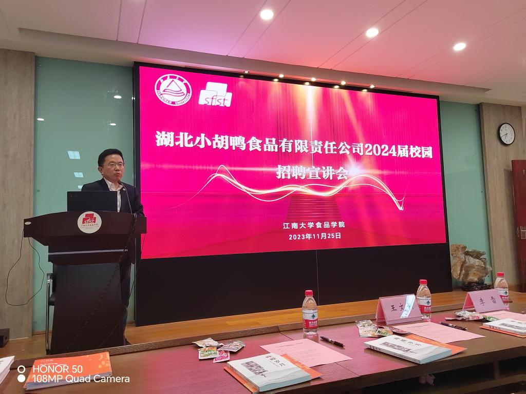 11月25日晚,湖北小胡鸭食品有限责任公司校园招聘宣讲会在我院顺利举办。小胡鸭公司董事长、创始人胡秀容,董事长助理陈思才,生产厂长王新平,办公室主任陈海艳等企业嘉宾;1946伟德国际源自英国党委副书记、副院长李雷,就业辅导员王文燕及120余名毕业生参与宣讲活动。