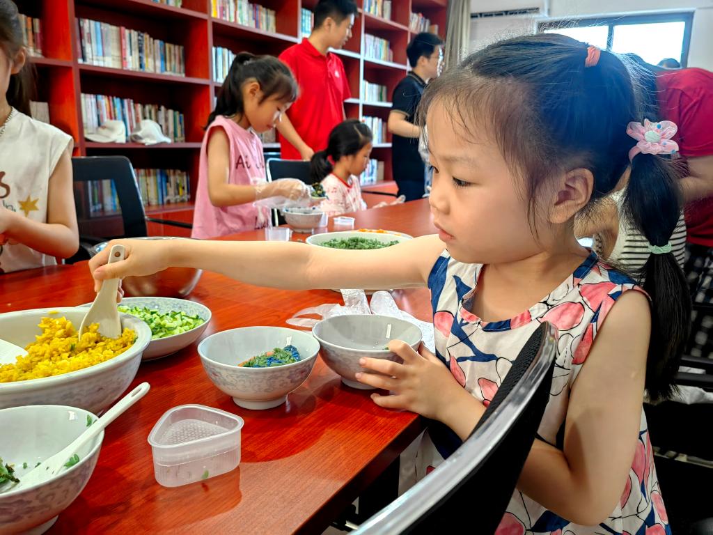活动开始前,大学生食育“教员”们悉心准备饭团食材,并结合不同孩子的性格特点提前设计有趣的互动环节。授课过程中,陈烯、王曾鸿等实践团成员向小朋友们耐心讲解五彩饭团的发展历史和文化背景,以及五彩饭团的配色原理和色彩等知识点。在实践环节中,食育“教员”们手把手教学,亲身示范如何制作五彩饭团,并鼓励孩子们积极动手,发挥创造力和热情,做自己最爱的五彩饭团。通过本次食育实践活动,小朋友们收获了开心与快乐,也认识了食物色彩搭配的奇妙知识。