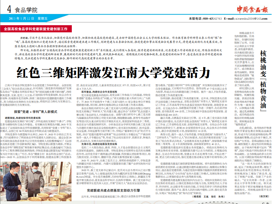 5月12日《中国食品报》报道了1946伟德国际源自英国党委以红色三维矩阵激发党建活力的经验做法。作为全国伟德国际标杆院系、全国首批“三全育人”综合改革试点院系,1946伟德国际源自英国党委针对高校二级党委共同面临的“发展孤岛效应”“党建业务两张皮难点”和“国家战略支撑不够问题”,持续聚焦党委、支部、党员三大主体,打造校际学科党委矩阵、校企合作支部矩阵、校地服务党员矩阵,探索二级党组织党建联建共建的工作模式,努力将政治优势转化为发展优势,将组织活力转化为发展动力,将党建成效转化为发展实效。随后,浙江大学、吉林大学、西北农林科技大学等13所高校围绕党建思政、立德树人、三全育人、服务国家战略等主题分期介绍了工作经验。