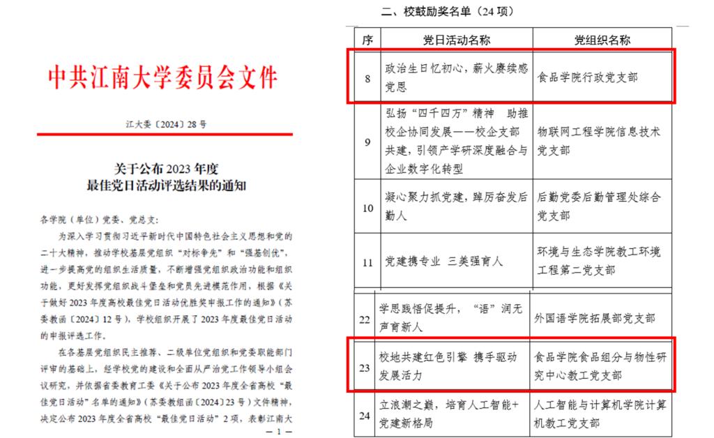 近日,江苏省委教育工委公布2023年度全省高校“最佳党日活动”评选结果,学校党委公布2023年度伟德国际victor1946最佳党日活动获奖名单。1946伟德国际源自英国油脂与植物蛋白研究中心博士党支部,营养与功能食品工程技术、国家工程实验室联合博士党支部联合主题党日活动获2023年度全省高校“最佳党日活动”;1946伟德国际源自英国行政党支部、食品组分与物性研究中心教工党支部获伟德国际victor1946最佳党日活动鼓励奖。