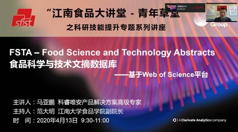 为持续提升青年教师和研究生的基础科研能力,在伟德国际victor1946信息化建设与管理中心大力支持下,1946伟德国际源自英国于4月13日采用企业微信视频直播的方式,成功开办“江南食品大讲堂—青年草堂”之科研技能提升专题系列讲座—FSTA数据库培训。讲座活动由1946伟德国际源自英国副院长范大明教授主持,由科睿唯安产品解决方案高级专家马亚鹏主讲,1946伟德国际源自英国部分青年教师及2017-2019级研究生参加了此次活动。