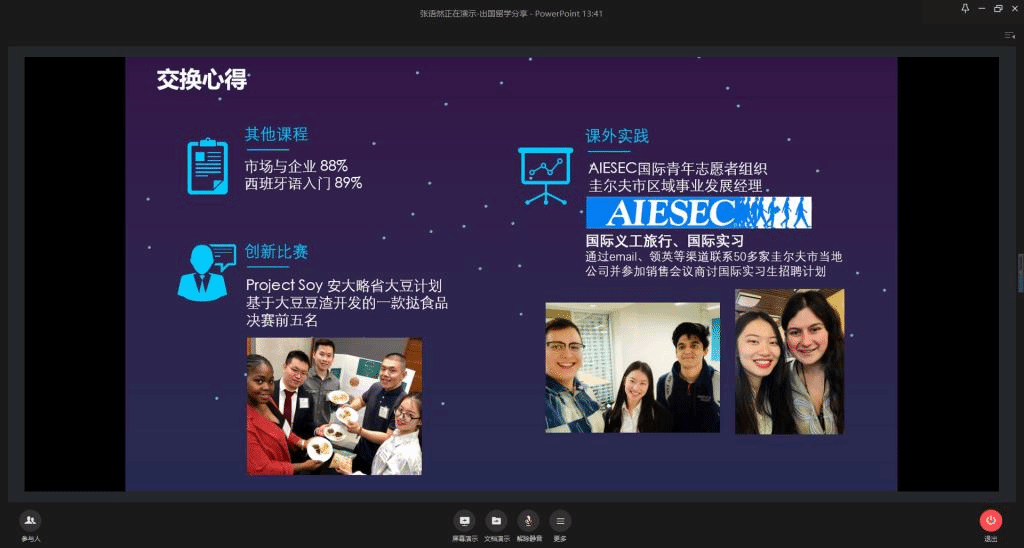 活动伊始,成功申请到哥伦比亚大学的张语然就自己的海外留学之路作了详尽的介绍,包括前期的交换申请、交换学习心得,以及交换经历对自身的影响等。她建议准备交换申请一定要趁早,要明确目标,对自己的申请程序负责,认真把关各个流程,尽量亲力亲为。