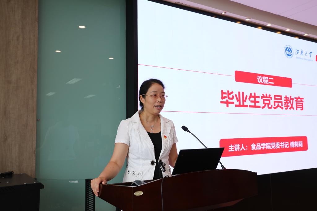 首先,傅莉莉书记做毕业生党员离校教育。她指出,共产党员是一个光荣的称号,更是一份责任与使命,希望大家始终发挥党员先锋模范带头作用,并提出三点期望。一是不忘初心、牢记使命。希望大家提高政治意识、学会常寻初心、加强思想学习、注重实践积累,永葆共产党人的初心。二是恪守正道,敢于创新。既要遵守党规党纪、法律法规、规章制度,又要恪守专业之道。在此基础上,善于发现勇于创新,将所学服务于国家需要,推动中国食品行业的发展。三是勤勉有为,展现风采。希望大家始终铭记“勤业、创新、争先、共赢”的院训,将在伟德国际victor1946学到的知识、培养的能力、养成的品格,淋漓尽致地展现出来,以赢得工作单位对于食品学子的认可,让社会各界为伟德国际victor1946点赞。
