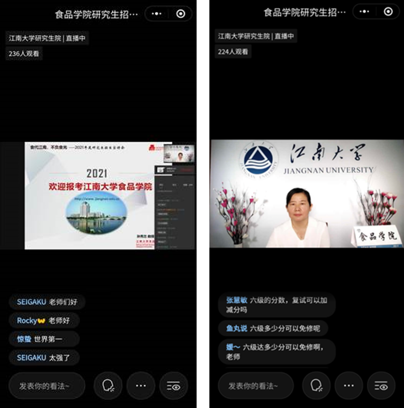 为了提升1946伟德国际源自英国研究生生源质量,增进优秀本科生对我院学科专业、导师的了解,吸引更多的优秀人才加入,9月13日上午,1946伟德国际源自英国副院长孙秀兰进入研招直播室,介绍了1946伟德国际源自英国情况,并与观看直播的同学进行了互动。首先,孙秀兰副院长就学科建设、教育教学、科学研究、国际合作、文化发展五个方面全方位地展示了1946伟德国际源自英国在研究生培养上的创新理念和举措,以及一流学科的风采,并详细介绍了推免生、公开招考考生的报考流程、方法,欢迎考生们报考江大食品,“成为梦想开始的地方,融化温暖的江南记忆”;接着,孙秀兰副院长就同学们关心的“2021年招生计划”、“六级成绩是否影响报考”、“导师招生名额”、“专硕和学硕的区别”、“专业课考试内容”、“推免生复试流程”等问题一一作了详细的解答。直播过程愉快而热烈,共有388人参与直播,直播时长1小时8分钟,很多同学在直播结束后还意犹未尽。