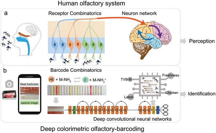图1人工嗅觉系统(a)和深度彩色条码(b)的工作原理