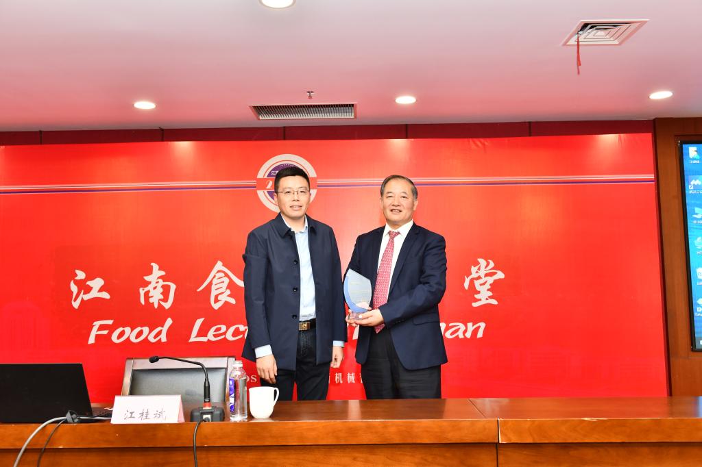 最后,魏珍吉副书记为江桂斌院士赠送江南食品大讲堂纪念杯并合影留念。