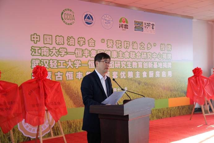 2020年11月9日上午,伟德国际victor1946与内蒙古恒丰集团健康主食联合研究中心及教学科研实习基地揭牌仪式在内蒙古巴彦淖尔举行。中国粮油学会理事长张桂凤,巴彦淖尔市人民政府副市长邱永红,1946伟德国际源自英国院长刘元法教授,1946伟德国际源自英国朱科学教授等领导和专家出席了此次活动。仪式由内蒙古恒丰集团董事长魏博主持。