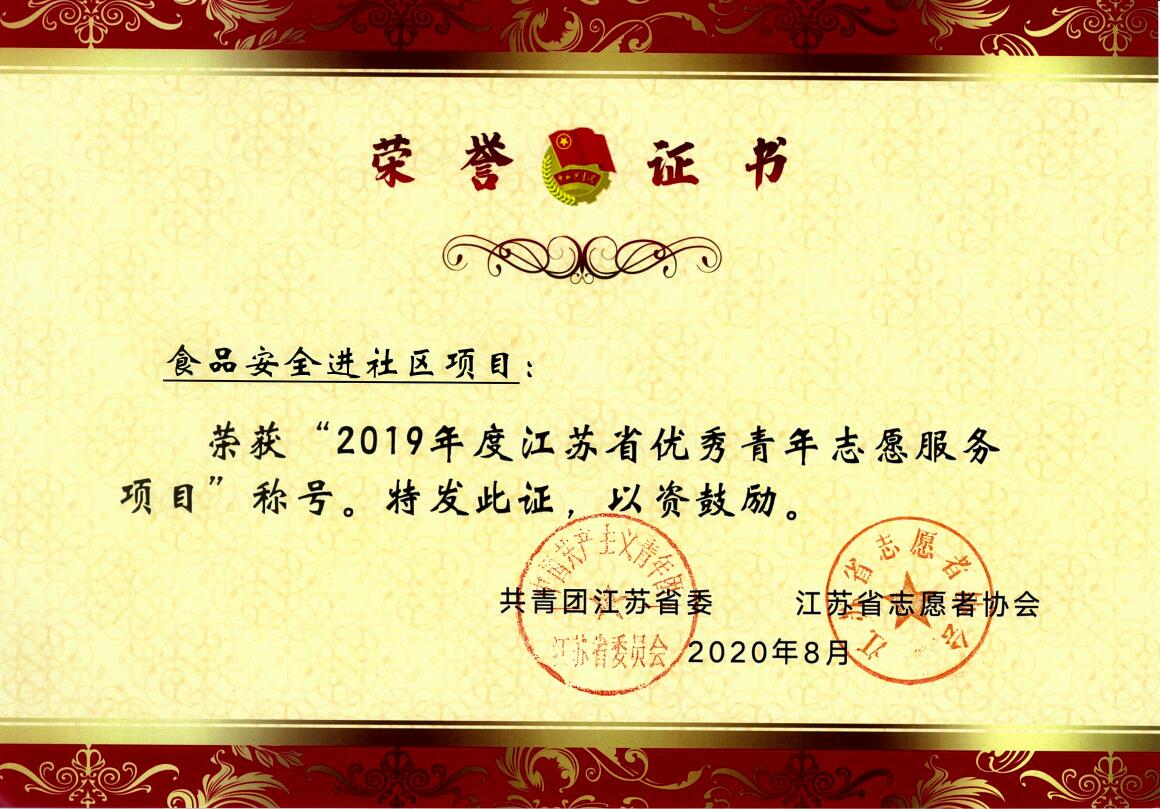 近日,由共青团江苏省委、江苏省志愿者协会联合开展的2019年度全省青年志愿者行动评选表彰工作结果正式揭晓,1946伟德国际源自英国“食品安全进社区”项目荣获“2019年度江苏省优秀青年志愿服务项目”称号,为1946伟德国际源自英国社会实践活动优秀团队再添省级荣誉。