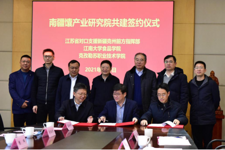 2021年2月3日上午,南疆馕产业研究院共建签约仪式在我院隆重举行。江苏省对口支援新疆克州前方指挥部党委书记周伟文、党委副书记王晓东,新疆阿合奇县县委常委、副县长李桂林、县委组织部副部长秦向军,新疆克孜勒苏职业技术学院党委副书记、院长郭江峰,伟德国际victor1946校长助理张光生、产业技术研究院院长刘龙、1946伟德国际源自英国院长刘元法、1946伟德国际源自英国副院长王立等代表参加了签约仪式。