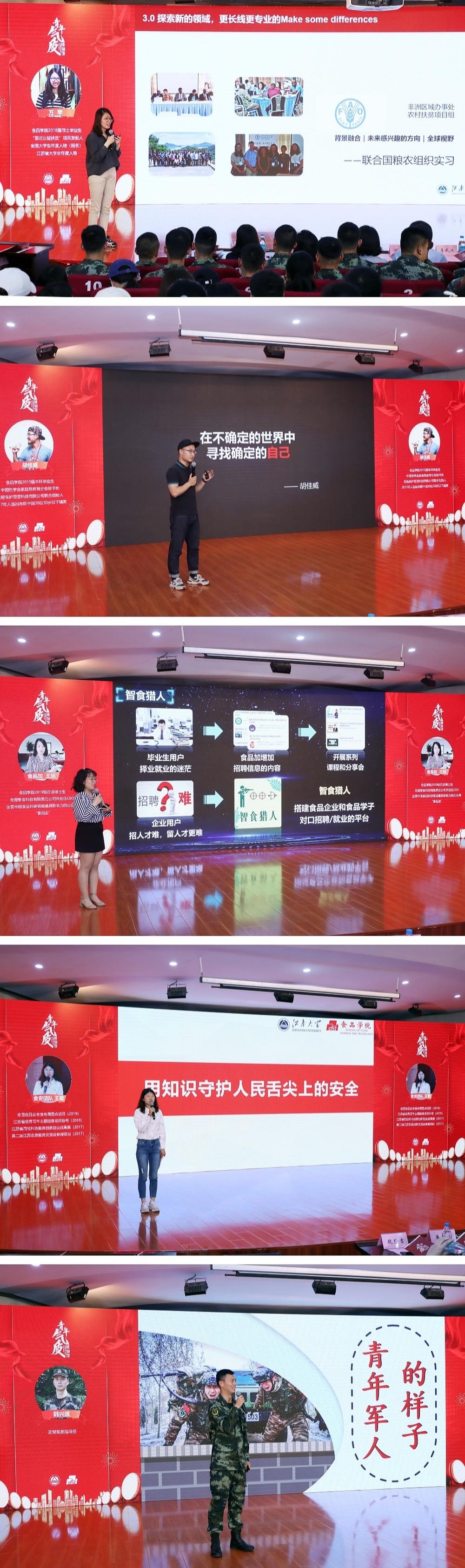 随后,四位“食品青年气质守护人”代表讲述了展品背后的故事。1946伟德国际源自英国2018届硕士毕业生、“惠炬公益扶贫”项目发起人万芊分享了她在非洲支教、联合国粮农组织实习等经历和人生感悟;1946伟德国际源自英国2015届本科毕业生、无锡保护豆豆科技有限公司联合创始人胡佳威分享了他的大学生涯和创业经历;1946伟德国际源自英国2019级在读博士生、无锡智食科技有限责任公司CEO王旭介绍了创业项目立足食品领域的发展历程;1946伟德国际源自英国2018级在读硕士生、“食品安全进社区”王敏介绍了团队进社区、进校园、进广场的志愿服务行动。“食品青年气质博物馆”还专门设立了“军旅特展”,展示当代青年军人的气质与风采。活动现场特别邀请到武警某部战士讲述军人的故事,师生深受感动和鼓舞。