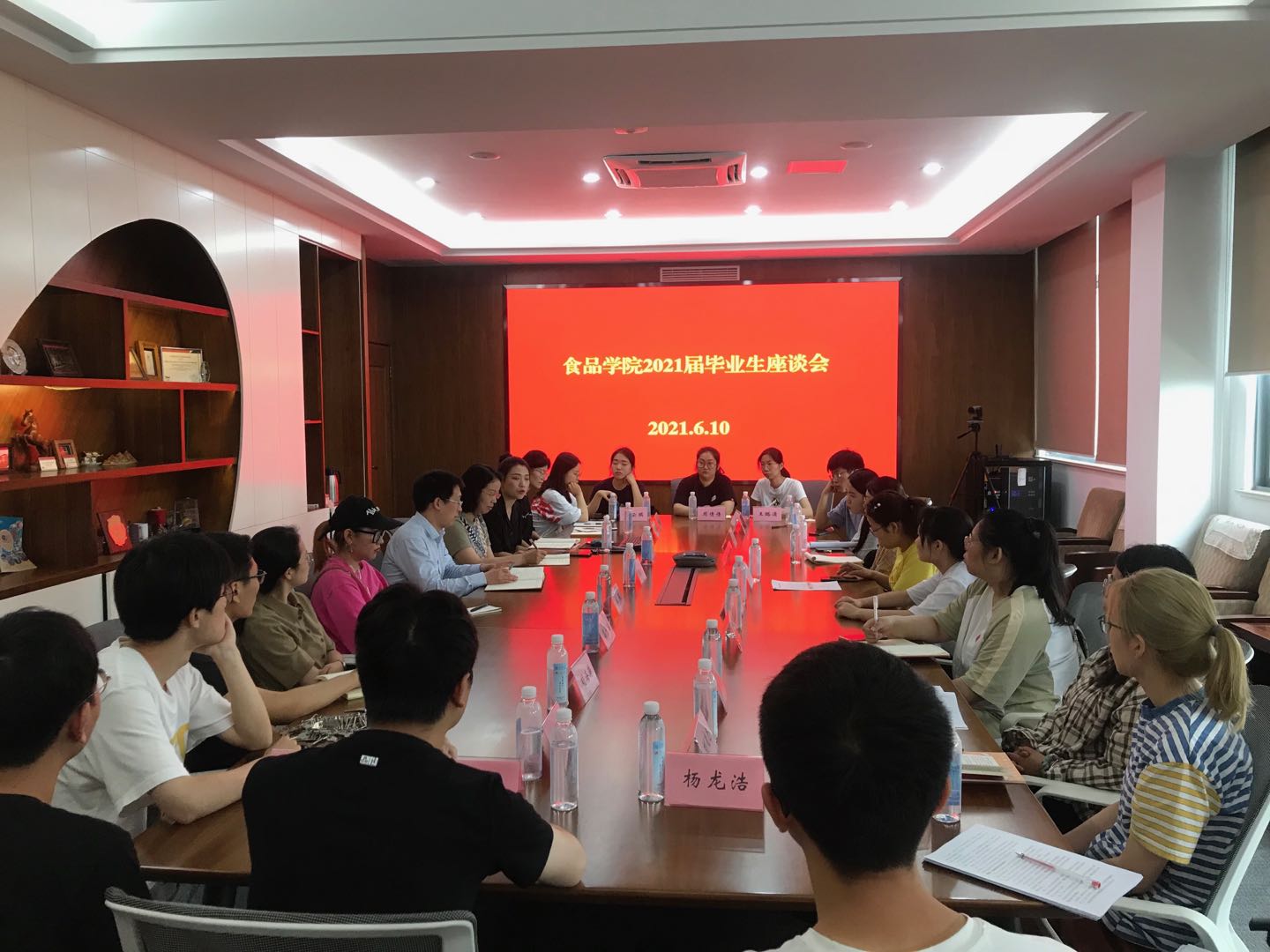 6月10日上午,1946伟德国际源自英国2021届毕业生座谈会在食品楼D925会议室举行。学院党委书记傅莉莉、副院长王立、毕业生辅导员胡晓丹出席座谈会,22名毕业生代表参加了座谈会。