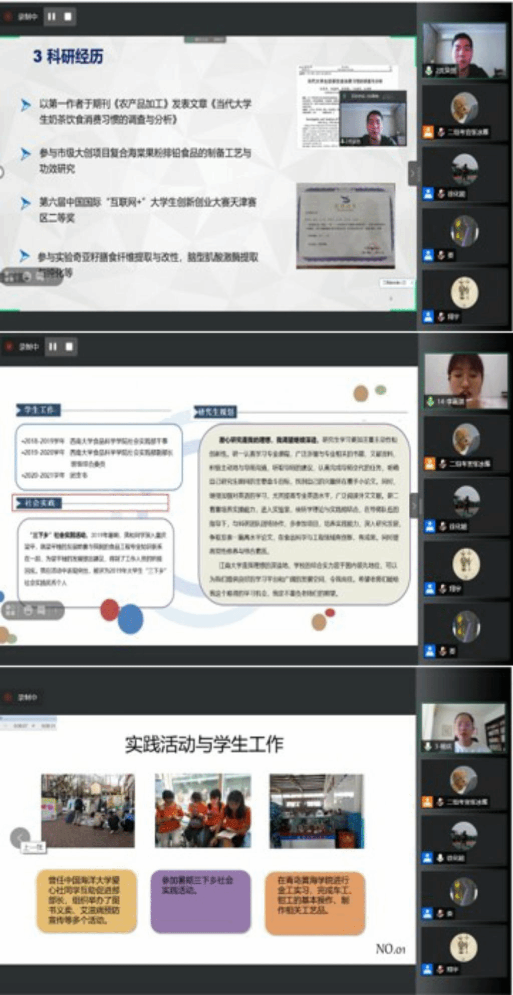 7月15日上午,营员们分为12个考场参加了本次夏令营的线上考核。同学们一一进行汇报,充分展示了自身的专业素养、研究潜力和科学思维能力。当天下午,夏令营举行闭营仪式。2018年夏令营优秀营员、1946伟德国际源自英国2020级研究生刘羿飞分享了自己从夏令营营员到江南食品人这一年的角色转变历程,他积极动员大家报考江南食品,实现人生梦想。成向荣老师为大家讲解了本次夏令营的相关情况,期待同学们来江南食品收获更多知识。严瑞芳老师介绍了2021年推免、考研的相关情况。最后,孙秀兰教授作总结讲话,她充分肯定了同学们的出色表现,基于不同视角向同学们提出了恳切的建议,欢迎大家加入1946伟德国际源自英国。