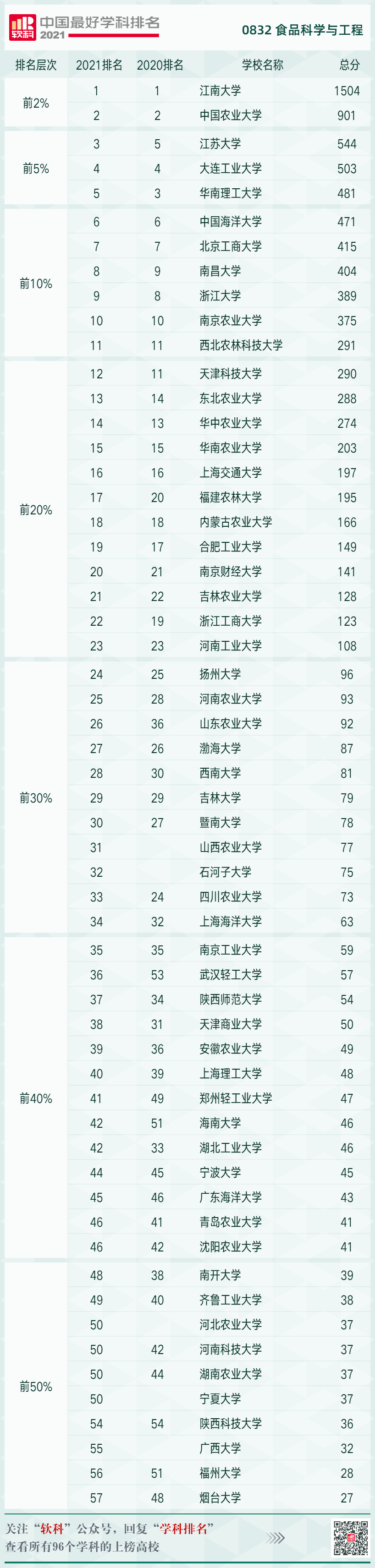 据悉,软科中国最好学科中“食品科学与工程学科”的指标体系包括人才培养、科研项目、成果获奖、学术论文、学术人才五个指标类别,下设13个指标维度,总计量化积分1650分。最新排名中,伟德国际victor1946以1504分位居榜首。完整排名名单如下: