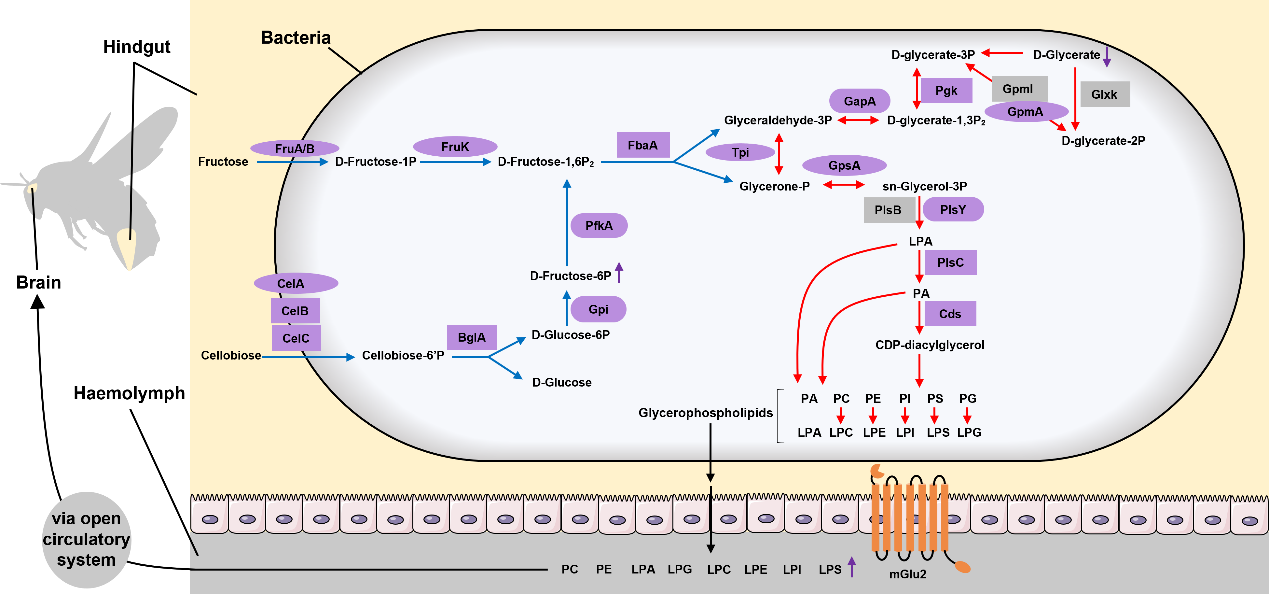 近年来,越来越多的研究表明食品功能组分可以通过肠-脑轴影响宿主的大脑和行为。特殊饮食干预、抗生素处理或疾病引起的菌群失衡及无菌状态都会影响宿主的学习记忆等认知行为。然而自然状态下健康个体的营养与认知能力的关系却少有研究。在该研究中,研究人员以熊蜂为研究模型,通过成熟的熊蜂视觉学习行为范式和宏基因组测序技术首先构建了健康个体记忆能力与肠道代谢的关系,发现一类乳酸菌(LactobacillusFirm-5)与记忆能力呈正相关。将其中的一株乳酸菌(L. apis)添加到食物中可以增强个体的记忆能力,而其他记忆不相关共生菌的添加不会影响宿主记忆。通过非靶代谢组检测,研究人员发现L. apis的补充可以提高血淋巴中多种甘油磷脂的含量。宿主补充其中增加最显著的甘油磷脂LPA(14:0)可以显著提高其记忆能力。最后,根据多组学等研究结果研究人员提出了一种可能的肠脑互作通路。此研究揭示了肠道磷脂代谢可以作为一重要因素影响宿主记忆能力,为通过补充食品功能因子改善人类个体的认知能力提供了理论支持。