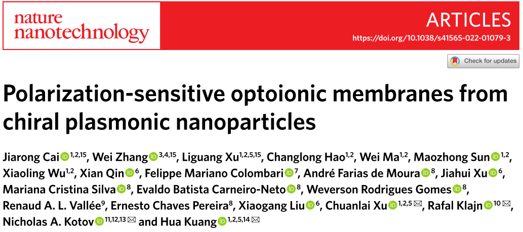 伟德国际victor1946胥传来教授团队受螳螂虾启发,利用金纳米颗粒自组装排列形成手性纳米膜,实现了圆偏振光的精准区分与识别,研究工作以Polarization-sensitive optoionic membranes from chiral plasmonic nanoparticles为题,于2022年3月14日24时在《自然·纳米技术》(Nature Nanotechnology)期刊上在线发表( https://www.nature.com/articles/s41565-022-01079-3)。