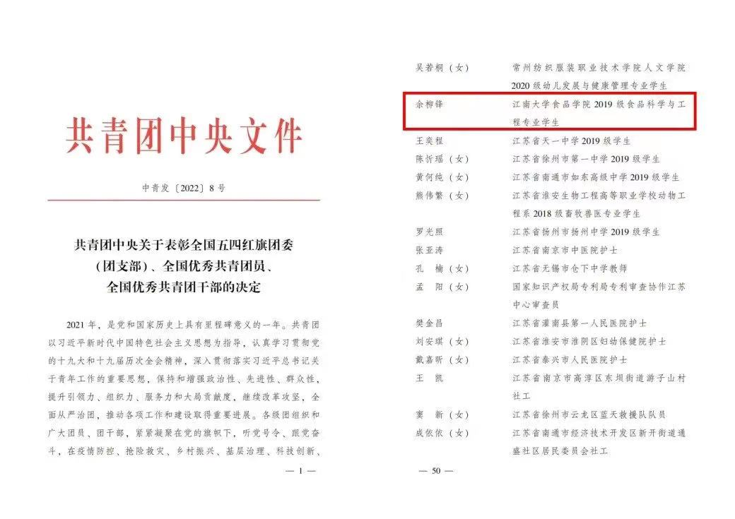 2022年是中国共青团成立100周年。近日,共青团中央发布《关于表彰全国五四红旗团委(团支部)、全国优秀共青团员、全国优秀共青团干部的决定》(中青发〔2022〕8号)。1946伟德国际源自英国2019级食品科学与工程专业本科生余柳锋荣获“全国优秀共青团员”称号。