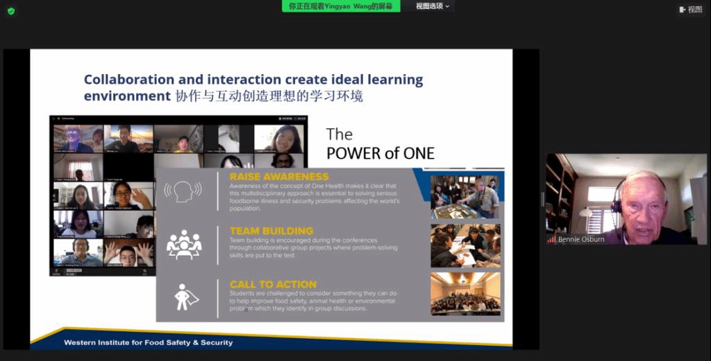 最后,加州大学戴维斯分校西部食品安全与保障中心、外展部主任Bennie Osburn向与会嘉宾作了“同一健康与食品安全”的主旨分享。他主要介绍了“One Health”的理念,指出需要将同一健康方法结合到未来食品系统中。同时他衷心期待各位学员能够珍惜每一次学习体验的机会,在本次夏令营活动中积极主动交流,助推未来食品发展。