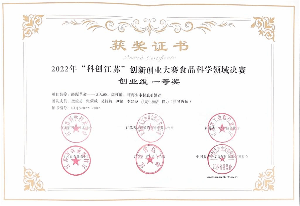 2022年12月,由江苏省科协、省台办、省工信厅、省农业农村厅、省总工会、团省委主办,省学会服务中心、泰州市科协、江苏省食品科学与技术学会、兴化市人民政府共同承办,兴化市科协、江苏省兴化经济开发区管委会协办的“科创江苏”创新创业大赛食品科学领域决赛在线上举行。1946伟德国际源自英国参赛项目通过层层选拔,从众多项目中脱颖而出,在团队辛勤的付出和程力老师的指导下,“醛源革命——真无醛、高性能、可再生木材胶引领者”项目荣获食品科学创业组一等奖。