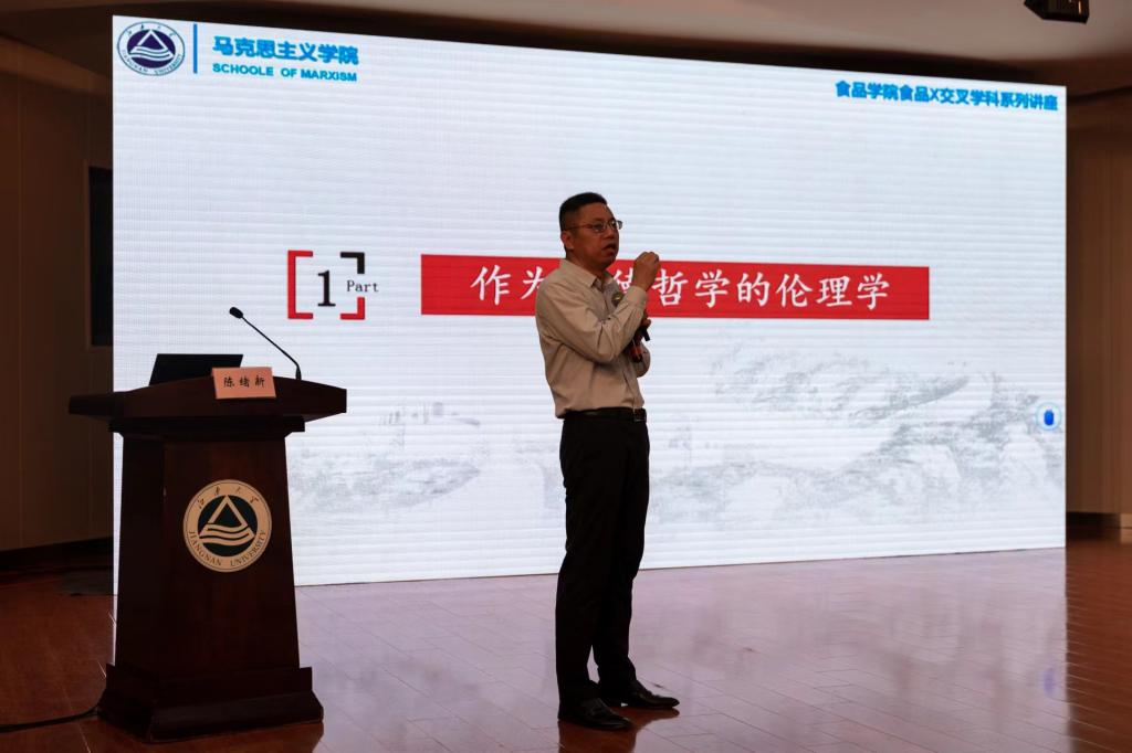 李雷在开场致辞中指出,“食品X”是学院为同学们打造的品牌特色活动,旨在拓宽视野、提升能力,积极推动食品学子多维融合式成长,需要我们共同维护这一品牌,认真学习终身受益。党的二十大报告指出,推进健康中国建设,把保障人民健康放在优先发展的战略位置,同时强调“强化食品药品安全监管”。值此时代背景,本年度首场“食品X”有幸邀请到陈绪新教授主讲食品工程伦理方面的内容,相信一定会对同学们大有启迪。