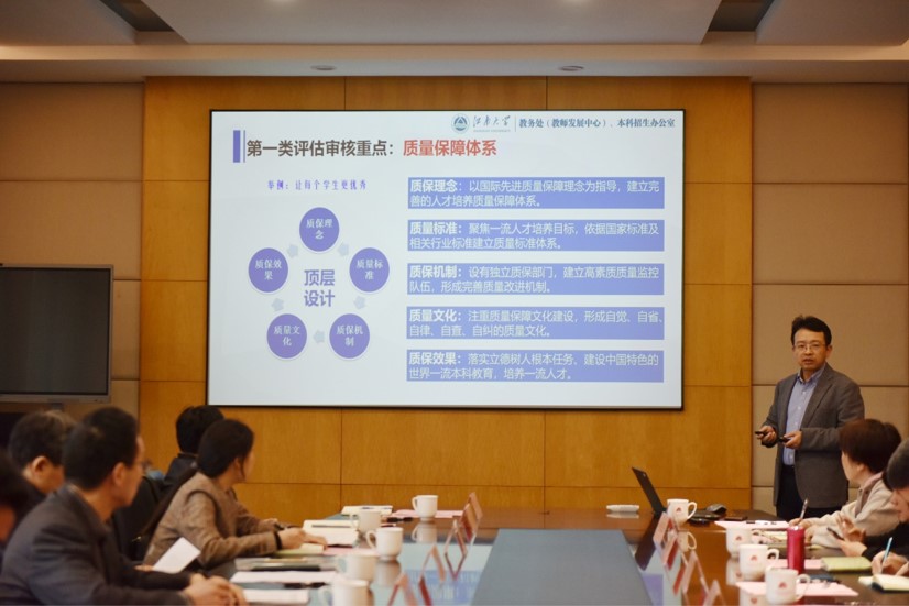 为深入开展学习贯彻习近平新时代中国特色社会主义思想主题教育,进一步以教学评估为契机夯实本科教育教学工作,4月24日上午,1946伟德国际源自英国本科教育教学审核评估工作宣讲会暨主题教育调研会在D910会议室召开。伟德国际victor1946党委常委、副校长堵国成,纪委副书记、党委巡察工作办公室主任丁文勤,教务处(教师发展中心)处长李兆丰,以及审核评估督察组、工作专班成员一行,1946伟德国际源自英国党政领导、教学督导代表、教师代表、本科教务工作人员等参加此次会议。会议由本科教学副院长谢云飞主持。