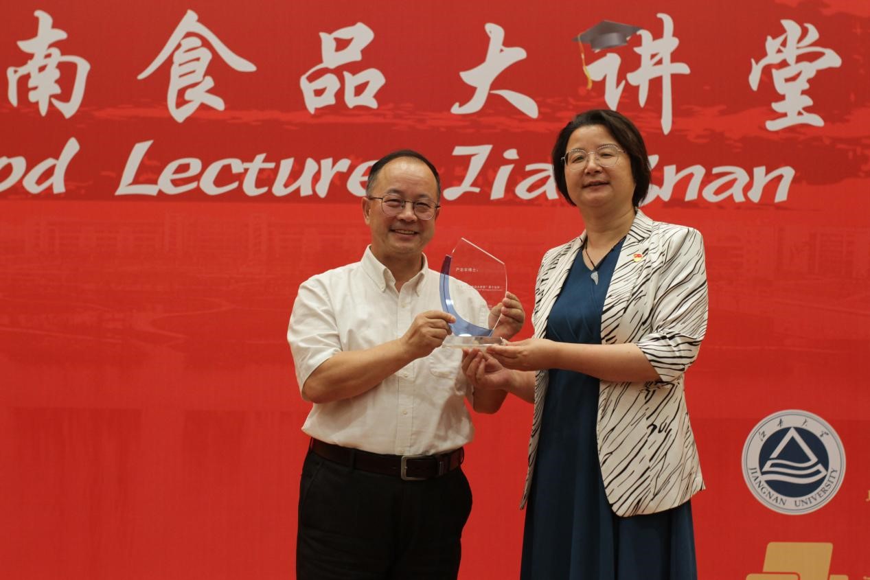 在互动问答环节,同学们就国际食品安全现状、中国食品安全文化、大学生生涯规划等问题,与嘉宾进行充分交流和探讨,现场气氛十分热烈。活动最后,姚卫蓉为严志农博士赠送江南食品大讲堂纪念杯并合影留念。