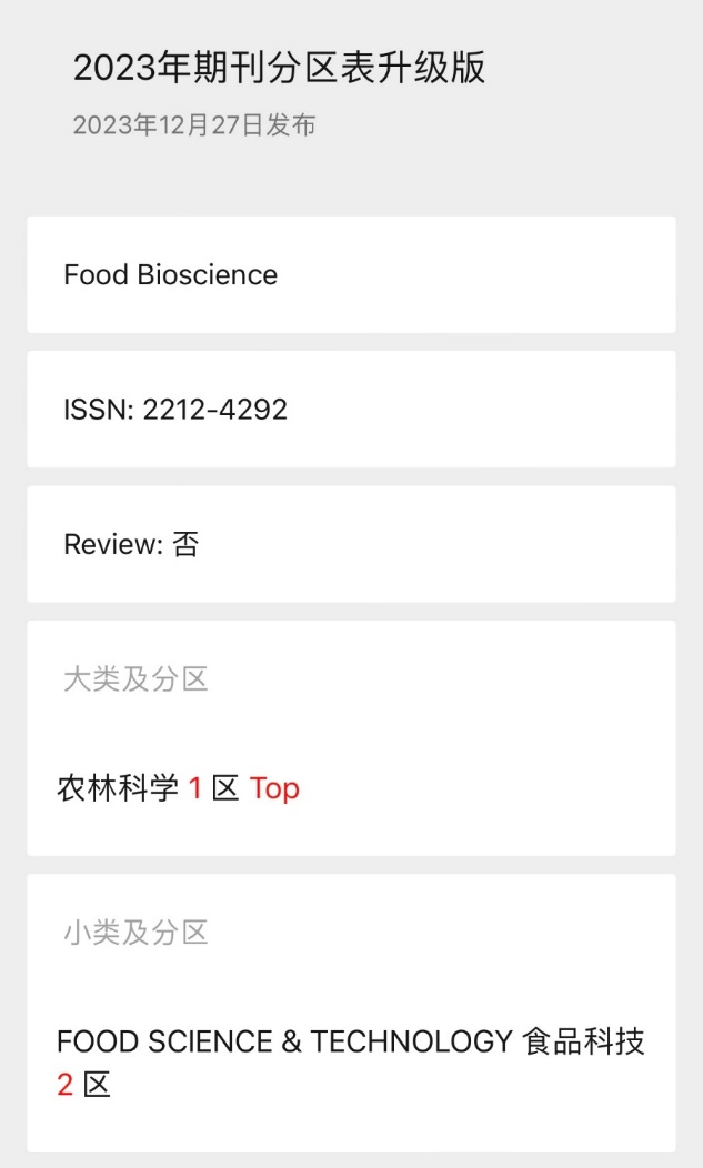 2023年12月27日,《2023年中国科学院文献情报中心期刊分区表》正式发布,爱思唯尔出版集团与伟德国际victor1946合作主办的食品类期刊《Food Bioscience》升至2023年中科院期刊分区表农林科学1区TOP期刊行列。