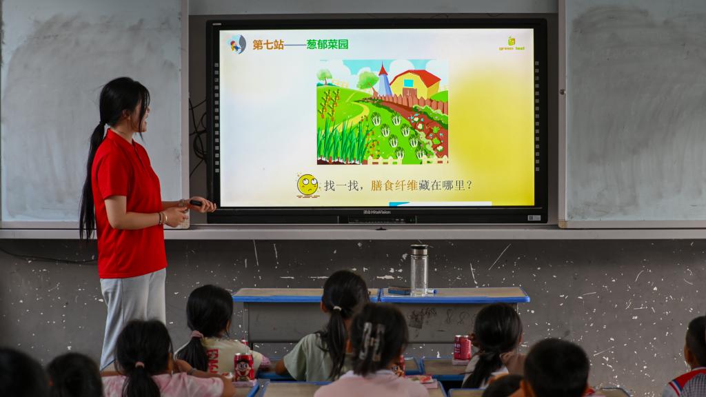 7月17日,师生们来到从江县独洞村,结合当地现状,为独洞小学的小朋友们带来一堂以“健康大冒险”为主题的科普食育课程。实践团成员、课程主讲人肖雨蕊带领少数民族的小学生们一起学习蛋白质、脂肪、糖类和膳食宝塔基本营养科学知识,指导大家进行合理膳食搭配,提升食品营养与健康。