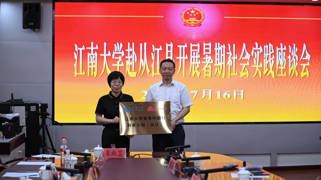 讨论交流环节之后,陈艳君代表学校向从江县颁授“伟德国际victor1946食育中国行科普小站”铭牌;李雷代表学院向从江县颁授“1946伟德国际源自英国实践育人校外基地”铭牌。此次授牌,为进一步巩固校地合作夯实了基础,也为食品师生在黔东南地区长期有效开展食育科普实践活动按下了加速键。