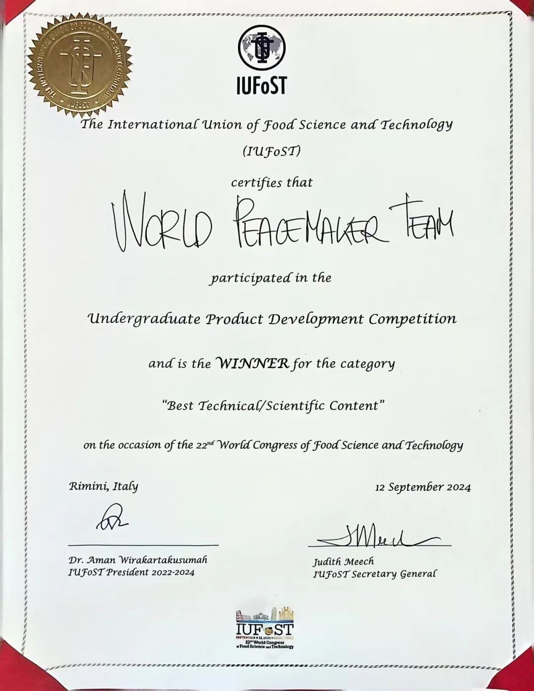 近日,第22届世界食品科技创新大赛在意大利里米尼落幕。伟德国际victor1946食品学子在这一国际顶级赛事中表现卓越,荣获本科生组“最佳科学技术奖”1项,研究生组全球提名奖、亚军各1项。