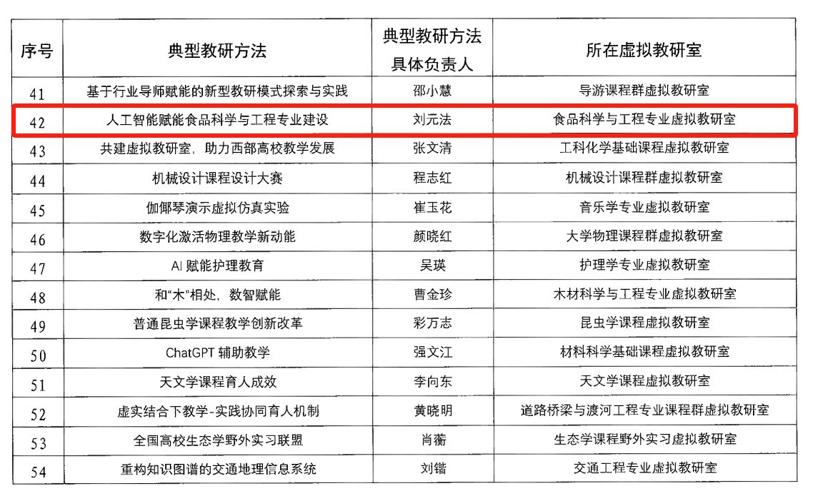 本次遴选工作聚焦“典型虚拟教研室”“典型教研方法”“典型教研成果”等三大维度。食品科学与工程专业虚拟教研获评的典型教研方法要求虚拟教研室工作能够结合信息时代背景,体现基层教学组织建设与教学实施的新思路、新方法,对于全面提升教师教学能力、促进教育公平等具有显著推动作用。