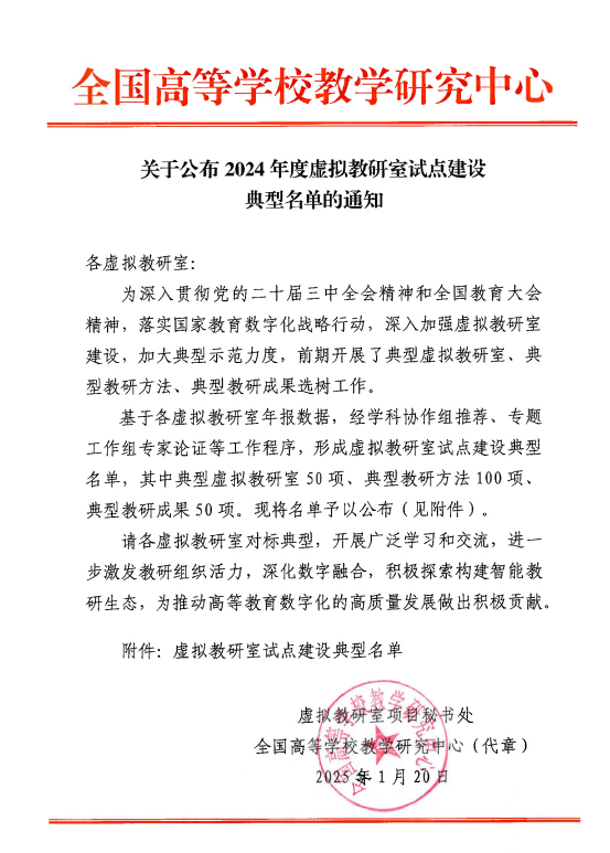 为深入贯彻落实党的二十大关于教育数字化的战略部署,积极落实全国教育大会精神,教育部虚拟教研室建设专家组近日公布虚拟教研室试点建设典型名单。经学科协作组推荐、专题工作组多轮论证及专家组严格评审,我校食品科学与工程专业虚拟教研室“人工智能赋能食品科学与工程专业建设”成功入选“典型教研方法”。