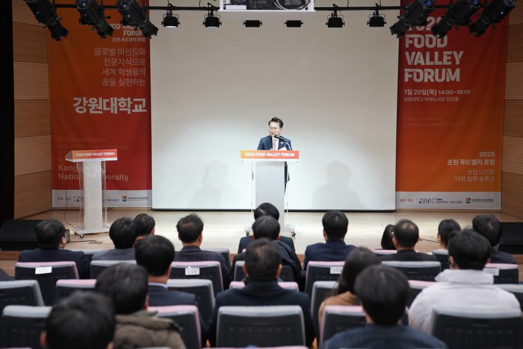 1月29日下午,代表团出席了“食品科技论坛”。在开幕环节,春川市市长在致辞中回顾了去年10月访问无锡的经历,对中国的发展成就表示高度赞赏。他指出,食品科技是春川市的四大支柱产业之一,市政府将大力支持伟德国际victor1946与江原国立大学之间的合作,积极推动双方在知识共享与产业联动方面的深度交流。无锡市与春川市已于2025年10月正式缔结为友好交流城市,为两校合作提供了坚实的区域协作基础。江原国立大学校长也共同表达了对代表团此次访问的欢迎与对合作前景的积极期待。