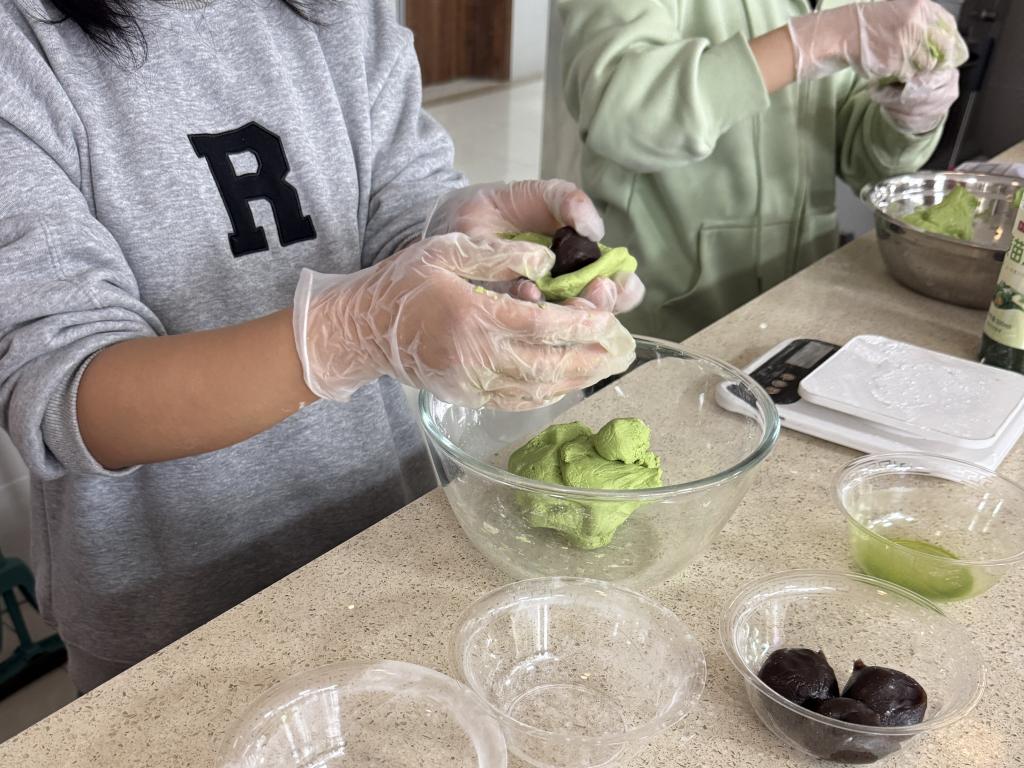 实验环节后,主讲老师现场展示青团完整制作流程:揉制艾草糯米面团、包入香甜馅料、细心塑形收口,动作娴熟流畅,一个个色泽鲜绿、形态圆润的青团逐步成型。小朋友们全程聚精会神,踊跃举手提问,在互动交流中清晰掌握制作要点,真切体会到传统美食制作的乐趣与匠心。