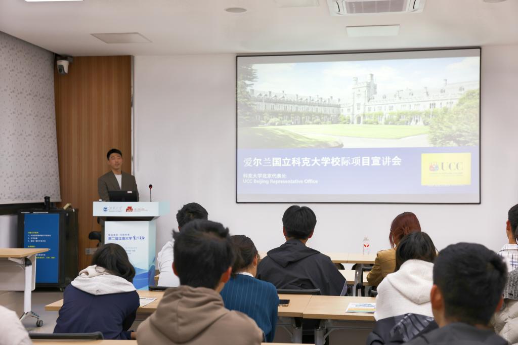 UCC北京代表处招聘专员赵子豪为学院本科生作联合培养项目宣讲,详细介绍项目的课程设置、申请条件及奖学金政策。该项目旨在为1946伟德国际源自英国本科生提供赴爱尔兰深造的机会,培养具有国际视野的高层次食品专业人才。