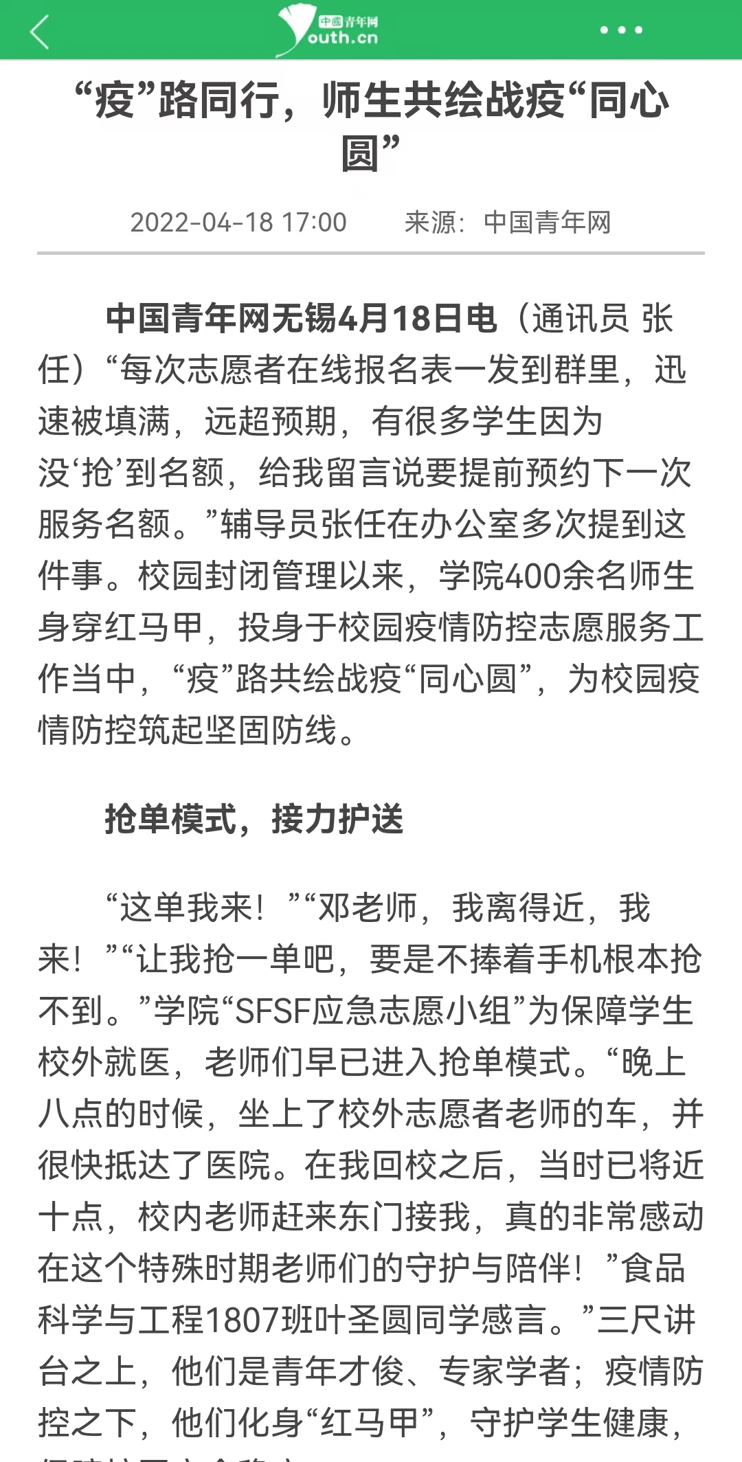 【中国青年网无锡4月18日电】(通讯员 张任)“每次志愿者在线报名表一发到群里,迅速被填满,远超预期,有很多学生因为没‘抢’到名额,给我留言说要提前预约下一次服务名额。”辅导员张任在办公室多次提到这件事。校园封闭管理以来,学院400余名师生身穿红马甲,投身于校园疫情防控志愿服务工作当中,“疫”路共绘战疫“同心圆”,为校园疫情防控筑起坚固防线。