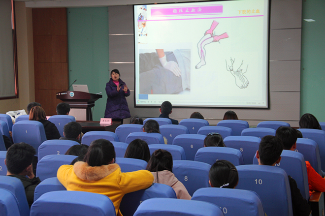 林毅老师系统介绍了地震、晕厥、溺水、烧伤、窒息等情况下的紧急处理,林老师用自带的急救箱,骨折固定夹板等急救物品现场讲解止血、包扎、固定、搬运四大救护技术,同学走上讲台现场学习绞棒止血法、止血带止血法、头顶帽式包扎、绷带包扎等止血包扎手法。林老师细致、幽默的讲解令同学们回味无穷。