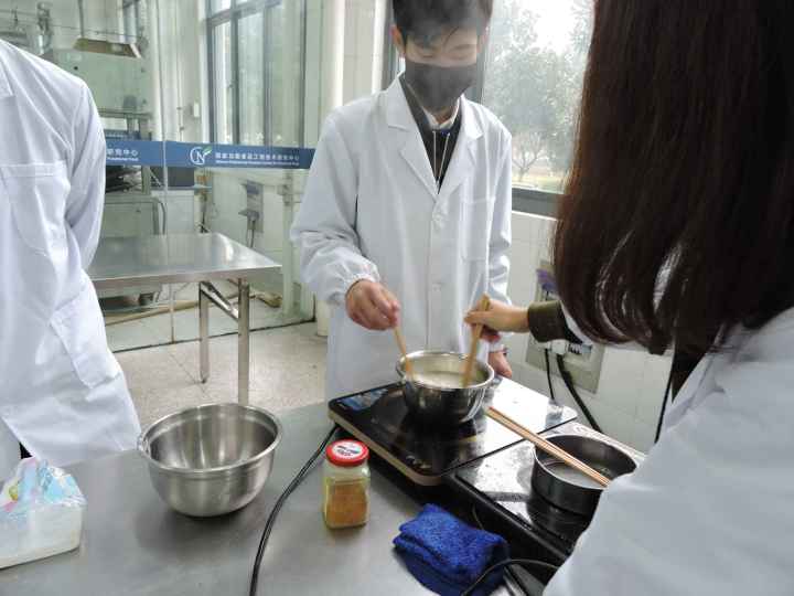 在调味品俱乐部同学的指导下,参与活动的同学们首先用电磁炉加热融化了准备好的琼脂。接下来,根据原料配比,同学们加入了适量白砂糖和糖桂花,并在容器中继续加热搅拌至糖浆呈透明拉丝状态。大家把熬好的糖浆倒入准备好的模具中,趁热加入自己喜欢的食用色素,并绘制图案。最后,同学们将创作完成的琥珀糖,放入冷藏柜,经过机器15-20分钟的降温冷冻后,取出切块,放在纸上风干,好吃又好看的琥珀糖就制作完成了。在活动的等待间隙,同学们还学习使用了棉花糖机,做出了各色各样的棉花糖。