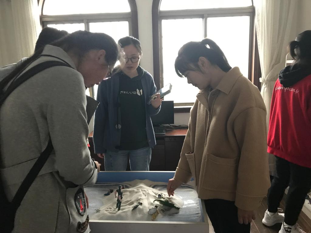 童老师首先向同学们对笃学楼进行了整体的介绍,一楼的主要职能为接待预约,二楼为教师办公处,三楼则主要用于心理咨询与治疗。童老师带领同学们参观了心理咨询中常用的硬件设施,如咨询室、放松治疗室、沙盘治疗室、团队辅导室等,并详细地讲解了预约的具体操作、心理咨询的过程及各种治疗方法等。在参观过程中,干事们积极主动地提出问题,童老师耐心地一一解答。最后,童老师和参与此次活动的食品学子在笃学楼门前合影留念。
