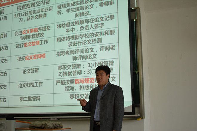 会议伊始,王周平副院长向大家介绍了毕业作业与毕业实习、毕业作业进程安排、毕业作业成绩构成等相关内容。他为大家讲解了毕业作业进程安排,并就相关规定与要求、常见问题作出了针对性的解释。并强调毕业作业由毕业设计、毕业论文和毕业实习构成,望同学们能好好利用这些时间来好好完善自己的最后一份作业。
