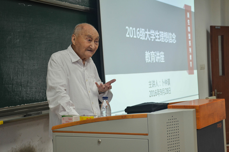 首先,卜老先生以满腔热情为同学们讲党史,他选取了从中国共产党成立伊始及其后27年间的抗日战争、解放战争等具有代表性的事件来详细讲述中国共产党在各个时期发挥的推动力。在讲述过程中卜老慷慨激昂地对同学们说“我们党已经走过了95年的历程,但我们要永远保持建党时中国共产党人的奋斗精神,永远保持对人民的赤子之心。”、“中国共产党的产生在中国历史上是一件开天辟地的大事。”卜老激情洋溢的演说赢得了在场同学的热烈掌声。接着,卜老引用习近平总书记的讲话“理想信念是生命的火炬,是灵魂的支柱”展开第二篇章,并强调:自强不息,艰苦奋斗是中华民族的内涵;学习应刻苦努力,勤奋思考;工作应积极进取,奋发图强。谈及同学的毕业去向,他言道,希望同学努力学习,向实现“两个一百年”奋斗目标前进。最后,卜老先生将目光转向当下,称正置中国共产党成立95周年之际,卜老先生告诫大一新生要“不忘初心,继续前行”,即便活在当下,我们依旧要不忘老一辈人的精神品质,以理想为矛,信念为盾,在社会主义核心价值观的引领下不断前行,不断进步。