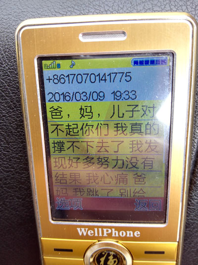 “爸、妈,儿子对不起你们,我真的撑不下去了,我发现好多努力没有结果,我心痛。爸、妈,我跳了,别给我收尸,太丢人。爸、妈,来世做牛做马报答你们。”3月9日晚上7点33分,郑先桥收到儿子郑德幸发来的最后一条短信。