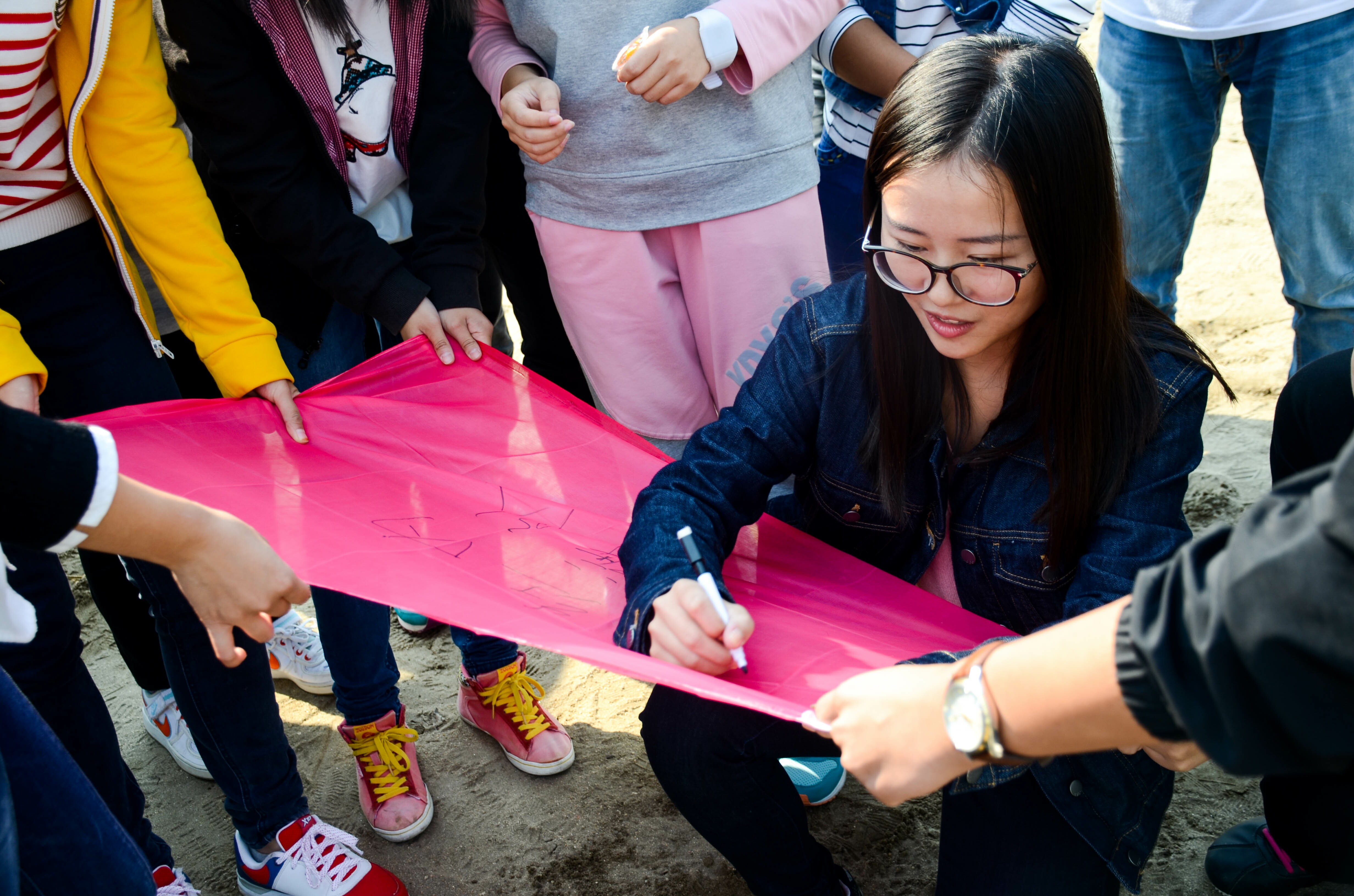 大家首先来到了沙滩上集中,并迅速地按照教练的指示整齐地拍成七排,博得了教练的夸奖。接着,大家按照教练的指示围成一个大圈,然后开始了一系列的互动。接下来,教练又将大家分成六组,在进行了黏口香糖的活动后,各组开始为自己的小组起了名字和口号,各种响亮的名字和口号层出不穷。