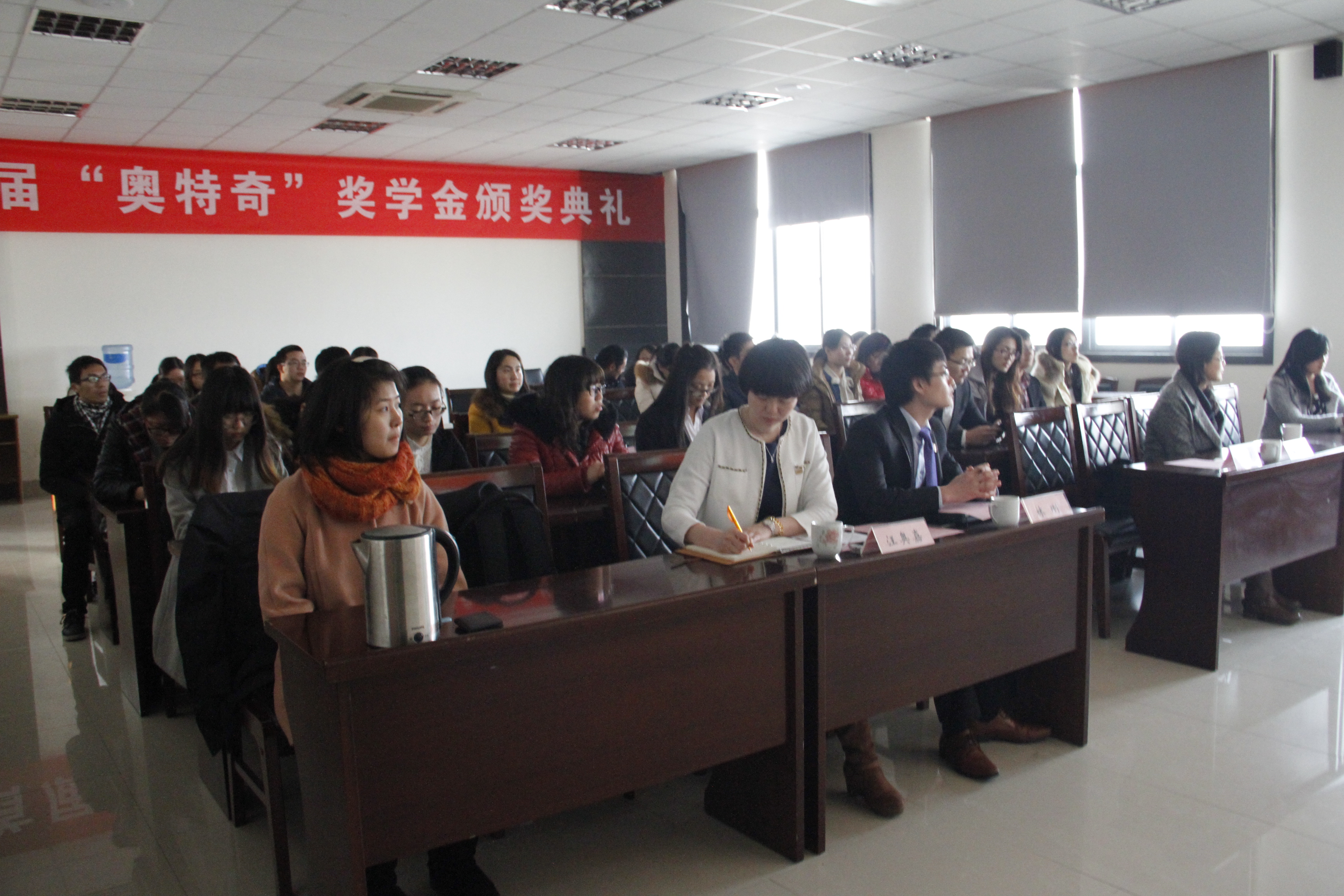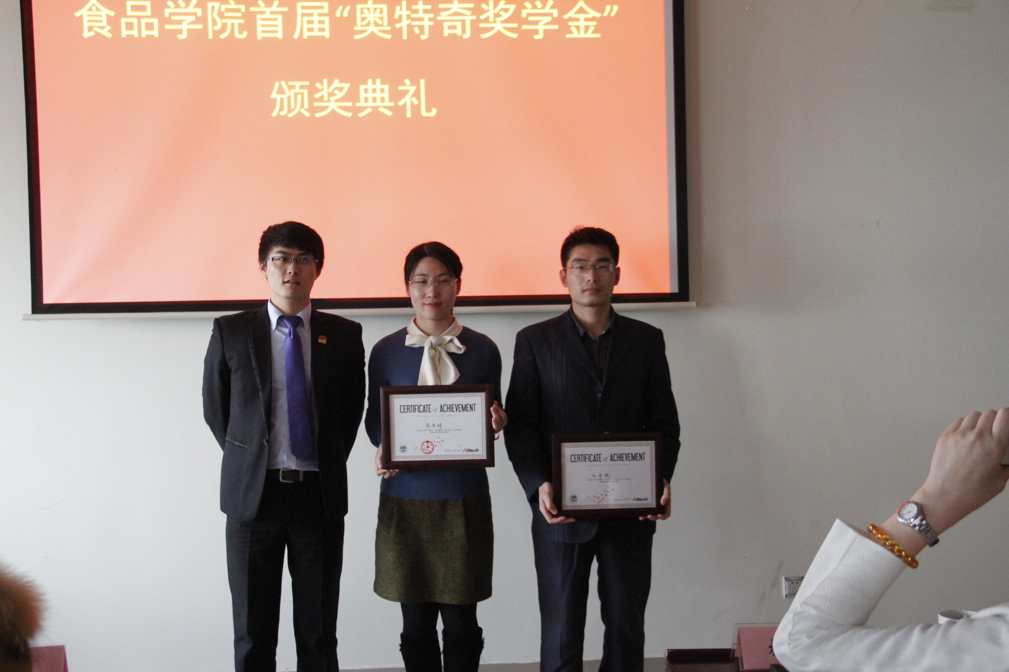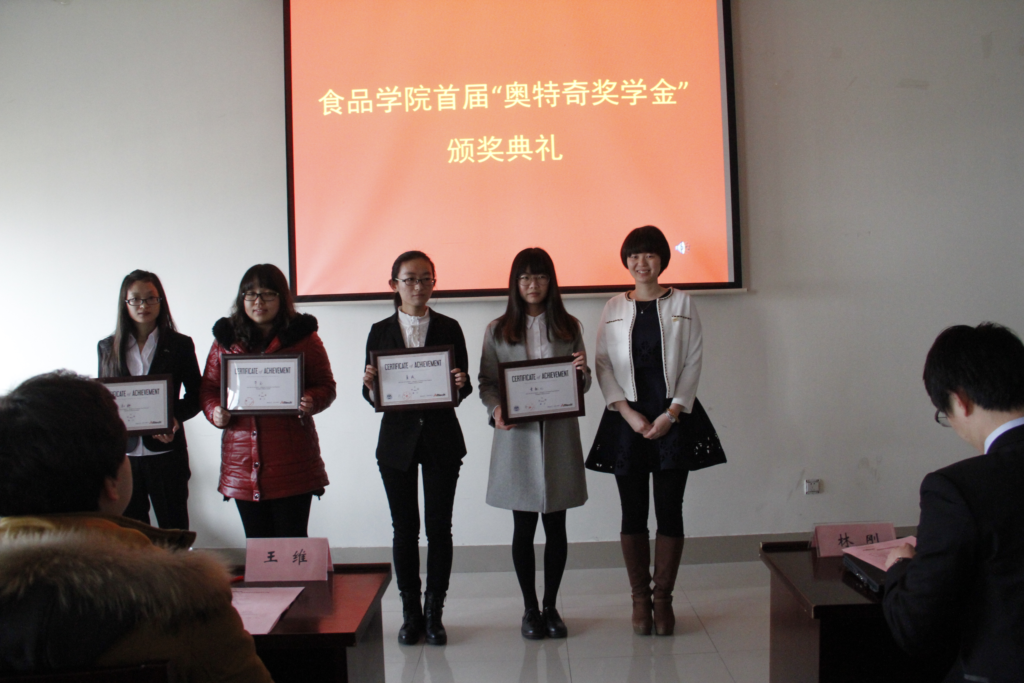 2015年1月23日下午3:30,首届奥特奇奖学金颁奖典礼在1946伟德国际源自英国D916双兔厅举行。奥特奇生物制品有限公司研究项目专员林刚先生、研发专员汪奥嘉女士以及1946伟德国际源自英国党委副书记、副院长王维老师、1946伟德国际源自英国油脂与植物蛋白中心蒋将老师出席活动,1946伟德国际源自英国辅导员曹淑慧老师主持。