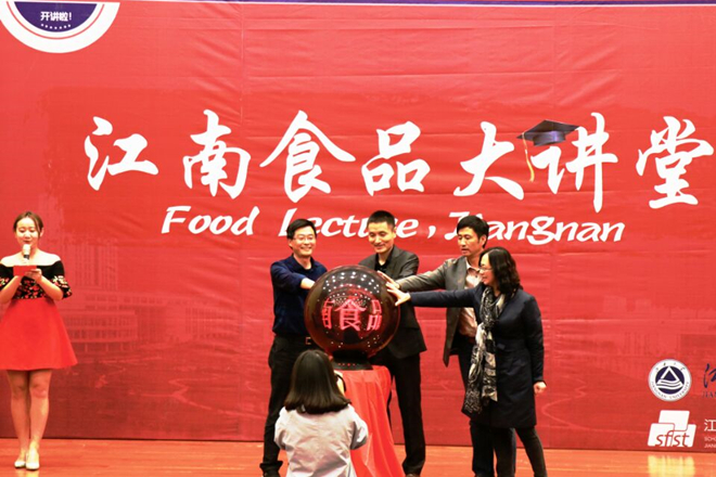 启动仪式在校党委副书记戴月波的开讲致辞中正式拉开帷幕,戴月波指出,作为未来的社会中坚力量,青年学生应该拥有辩证逻辑与人文情怀相结合的“新工科”思维,提高自我追求,进而阐明了开设“江南食品大讲堂”的重要意义。随后,戴月波与向琪、张文及校友覃祖见先生共同按动启动仪式触摸球,标志着江南食品大讲堂活动正式启动。
