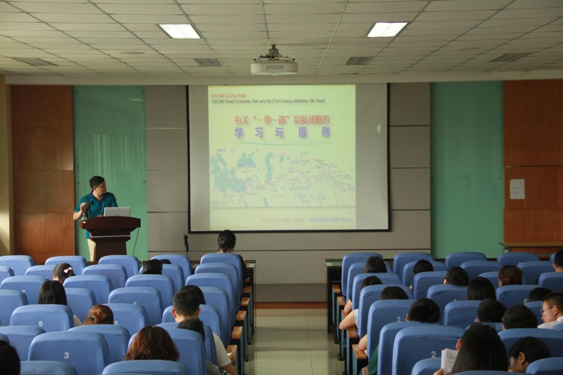 会上,王教授首先运用视频向大家介绍了“一带一路”倡议的背景和由来,直观形象地加深了党员代表们对“一带一路”倡议的认识,阐明了该战略契合沿线国家的共同需求,为沿线国家优势互补、开放发展开启了新的机遇之窗,是国际合作的新平台。接着,王教授深入剖析了我国提出该战略的原因在于我国的历史优势,制度优势和经济优势。然后,王教授和大家分享了自该战略实施以来我国已经取得的成绩,该战略深化了我国与中亚、南亚、西亚等国家的交流合作,促进了经济共同繁荣,形成丝绸之路经济带上重要的交通枢纽、商贸物流和文化科教中心,体现了和平、交流、理解、包容、合作、共赢的精神。基于该战略的实施情况,王教授认为该战略的前景光明,会在后金融危机时代给各合作国家提供新的经济增长之道,开创地区新型合作,进而推进全球经济再平衡。最后,王教授结合同学们的专业背景,在“一带一路”倡议背景下对同学们的个人发展提出了建议和期望。