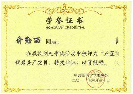 俞勤丽,曾多次获校级奖学金,获一次国家奖学金,获校级优秀团员称号,校三好学生。