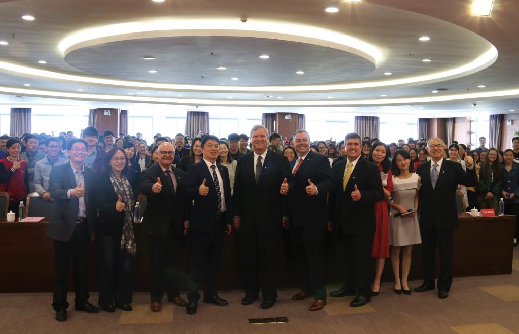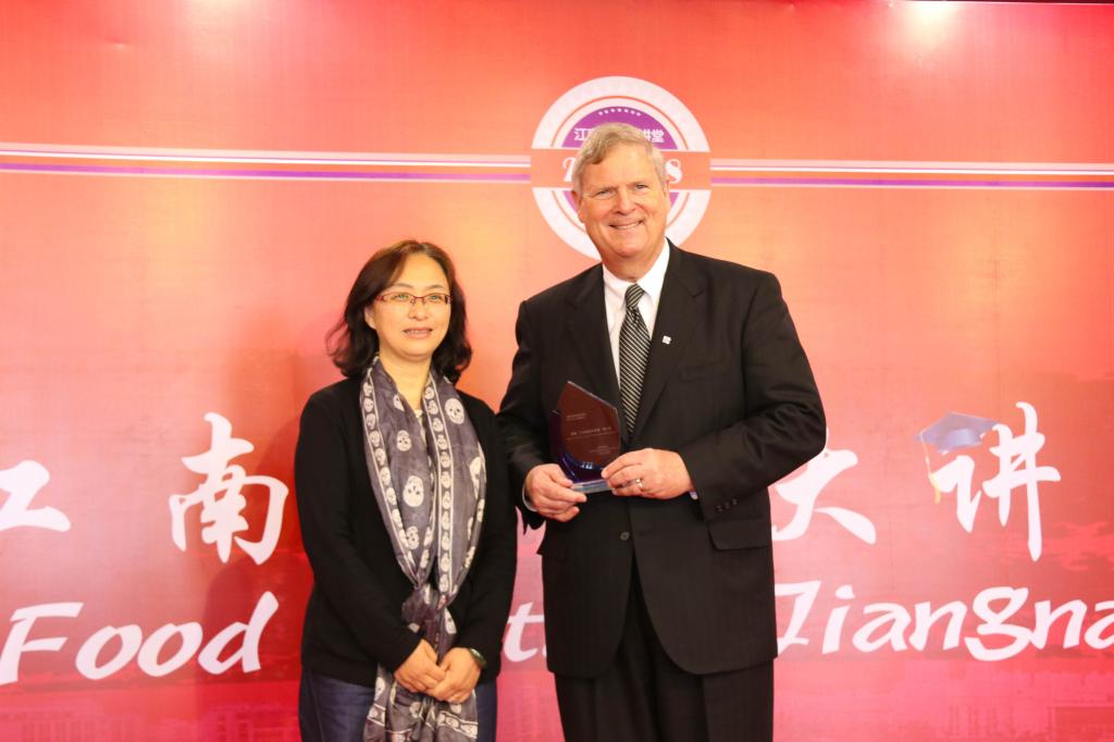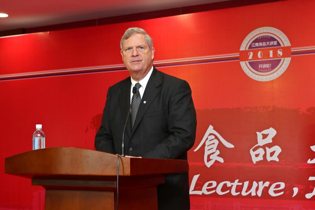 3月30日上午10时,江南食品大讲堂第六讲——气候智能型农业对满足世界食物需求的重要性(TheImportance of Climate Smart Agriculture to Meeting World Food Needs)在图书馆五楼报告厅举行。第30任美国农业部部长、美国乳品出口协会总裁兼首席执行官汤姆·维尔萨克(TomVilsack)应邀主讲。食品科学国家重点学科带头人、国际交流与合作处处长江波、院党委书记向琪、副书记张文、周鹏教授出席活动。300余名学子到场聆听。